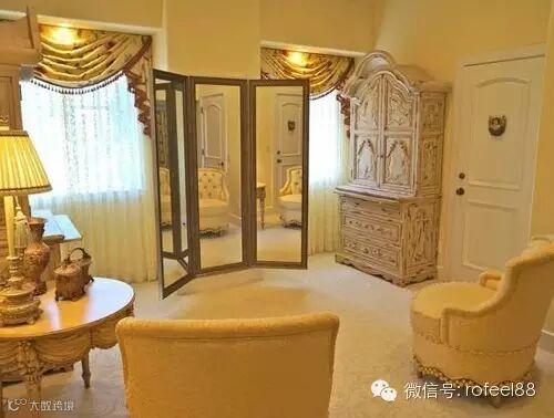 欧式可爱风格的衣帽间因为三面镜子而让它实用性非常高。纱质窗帘让变装的过程在光线稀疏中顾影自怜。软软的沙发让增加了衣帽间的舒适性。