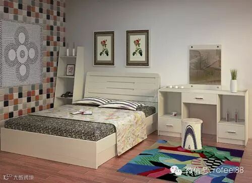 床头一侧摆放翻盖梳妆台,必要时还可作书桌用,或再在梳妆台上方悬一镜子与吊柜,不管是护肤品、书籍还是其他,皆可存放。装点了空间,又装点了心情,一举两得丫。