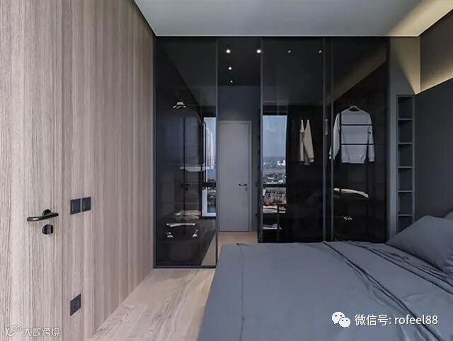 床尾则是采用了木饰面墙面与隐形门设计,方便每天找衣服的同时,也是显得更加时尚端庄。