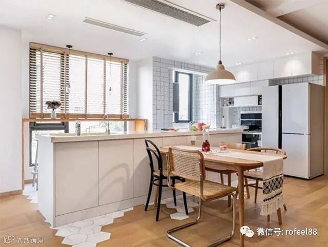 餐厅紧邻着开放式厨房,厨房采用L型的橱柜布局,冰箱、洗碗机等电器做嵌入式设计,充分利用空间。橱柜一侧是整面落地窗,利用结构凹陷嵌入吧台,闲来无事可以小酌一杯。