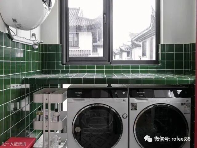 拉斐尔家具定制来给大家讲讲,家里还有一个小空间,作为家里的洗衣房,里面洗衣机、烘干机、壁挂洗衣机齐备,满足各种衣物的洗烘需求,侧面刚好放上一个小推车,用来收纳各种洗涤剂。墙面配色是复古绿的瓷砖,洗衣房整体颜值没得说。