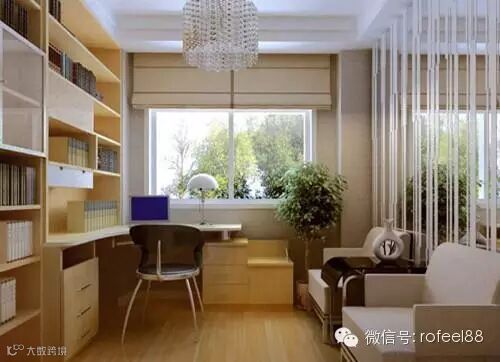 小户型书房还要坚持宽阔明亮,安顿上应当以简略规整为主,切勿摆放太多不必要的东西,书桌椅子等不要摆放在基地位置,防止显得拥堵。