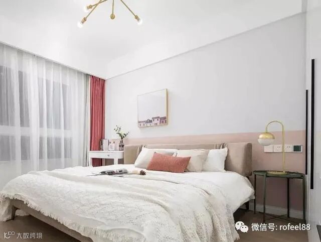 拉斐尔家具来给大家讲讲,整个卧室空间宽敞明亮,卧室背景墙采用的是两色拼搭,柔和的樱花粉可爱精致再搭配上干净的白色,显得卧室内的氛围温柔而又美好。