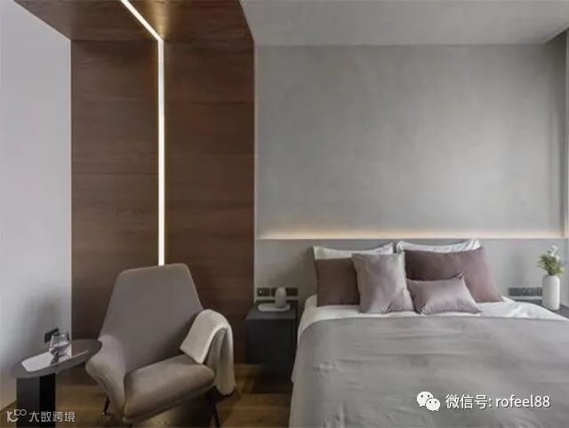 我们接下来再讲讲卧室,卧室是以女主人喜爱的沉稳色调为主,简单的水泥灰调搭配上深色木纹界定卧床和躺椅区,透过深浅对比横跨立面与天花产生空间层次。而收纳机能则尽量统整至更衣间以确保休憩区安定感。