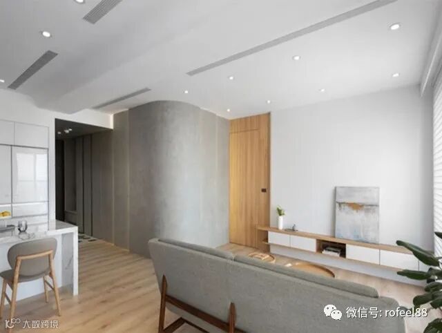 设计师在不同场域的转换皆运用弧线作为缓冲的延续造型,除了可以减少因场域转换产生的截断感,原木门和圆弧倒角的置入也可以充分缓减色调不一致的突兀感,使不同材质透过弧线与材质等元素得以整合,并丰富层次感及造型细节。