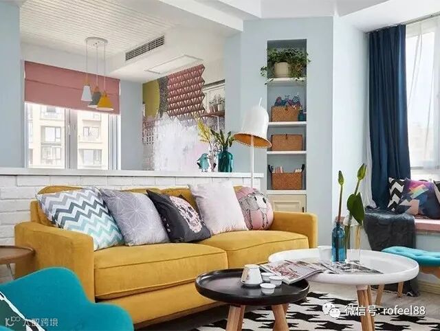4、如果实在希望沙发有靠的话,可以自砌矮墙,既不影响视线,也可以有个靠。在保留空间互动性的基础上,也可以用明确的功能分区,而且矮墙有时候也可以置物,摆放一些绿植、装饰品。