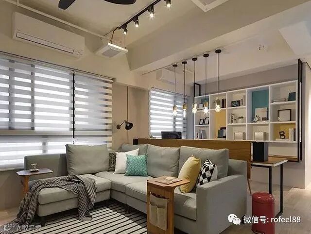 3、 有时候,为了增加客厅的置物能力,沙发背后可能会设计柜子或者置物架,这样的话沙发不靠到,可以方便取物。超小蜗居的话,客厅、书房、卧室都一体了,少了隔墙多了实用面积。