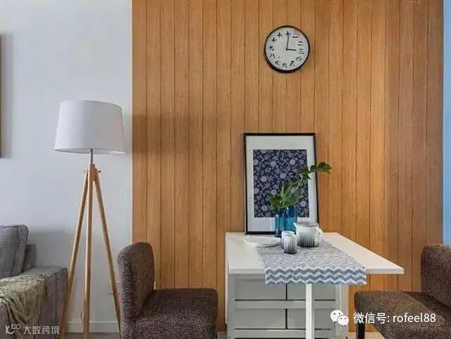 一张可折叠的餐桌搭配两个布艺软包的椅子,平时不用餐厅的时候就把它给收起来吧!墙面的木质造型让这个餐厅看起来更有格调。