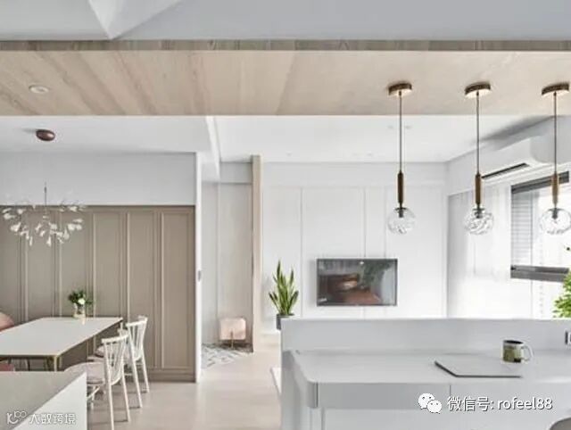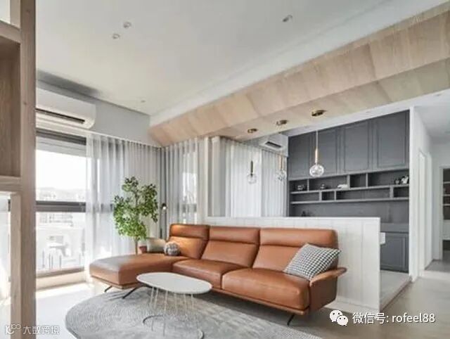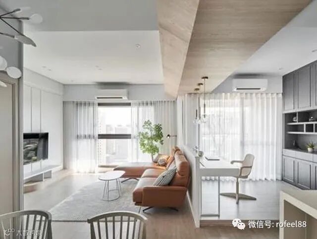 拉斐尔家具来给大家讲讲,我们可以看到因为客厅沙发与书房上方的大梁比较低,便利用木皮走斜角的方式,降低高度的视觉落差,这样看起来就没那么矮了,还比较有个性。