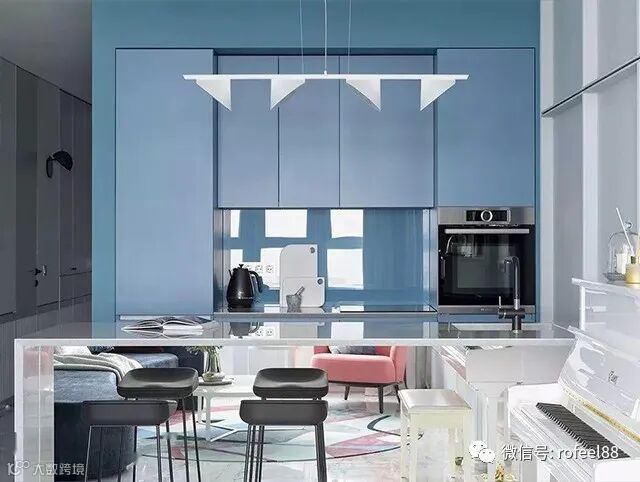 清水蓝的大面积使用可以给室内带来很强的视觉冲击。注意,无论是作为墙色、墙砖的使用,还是软装上的搭配,拉斐尔家具定制提醒大家,切忌多种颜色混合在一起,尽量保持整体的清爽,当然了,小面积的撞色还是可以起到意想不到的效果的。