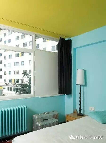 本款卧室采用姜黄色的顶搭配湖蓝色墙面,可以明显看出两者不同色系色度相当的颜色搭配起来略显不和谐,白色床品搭配湖蓝色墙漆本已十分亮眼,因此小编私以为天花板可改成白色或者很浅的蓝色,这样经调整色调会更和谐。另外,小编提醒,卧室不宜采用太明亮的颜色,尤其是亮黄色、大红色、橘红色等,可能会导致不易入睡。