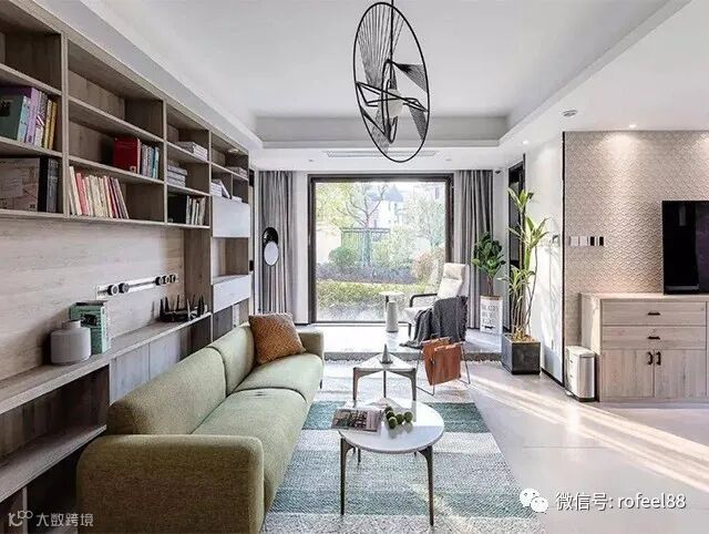 我们走进客厅瞧瞧,客厅的沙发墙做整面壁柜设计,开放式壁柜既方便收纳,又能作为装饰面。浅灰木色的壁柜,搭配浅绿色清新布艺沙发,整个空间的文艺感很强。