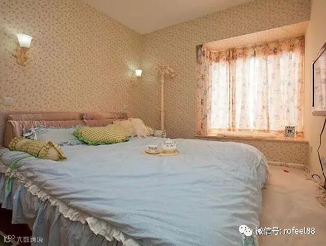 卧室也是碎花壁纸为整体基调,整体看起来十分的温馨协调,色彩也很统一,灯具的搭配也是恰到好处。