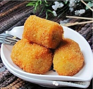 3、锅中油烧热放入裹上面包糠的香蕉.中小火炸制金黄.