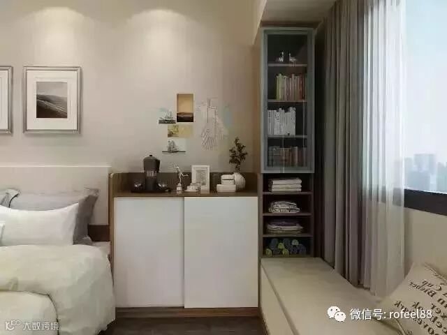 床头柜兼有收纳柜的功能,搭上飘窗上的小书柜,让卧室也能有一处休闲娱乐的地方。