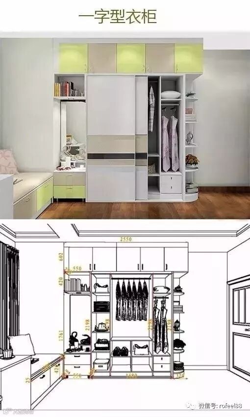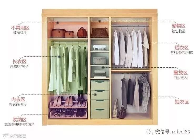 在进行定制衣柜之前,需要确定整个卧室的使用面积从而确定衣柜的大小和款式。衣柜也有符合人体工程学的说法,人们在整理物品时的最佳幅度,一般以站立时手臂上下左右活动能达到的范围为标准,所以衣柜设计通常根据人体动作行为和使用的方便舒适程度,将衣柜柜体划分不同的区域。