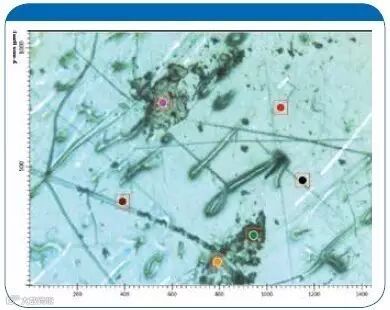 图示:用 LUMOS 显微镜获得的有污染物的样品及测试位置可见光图像