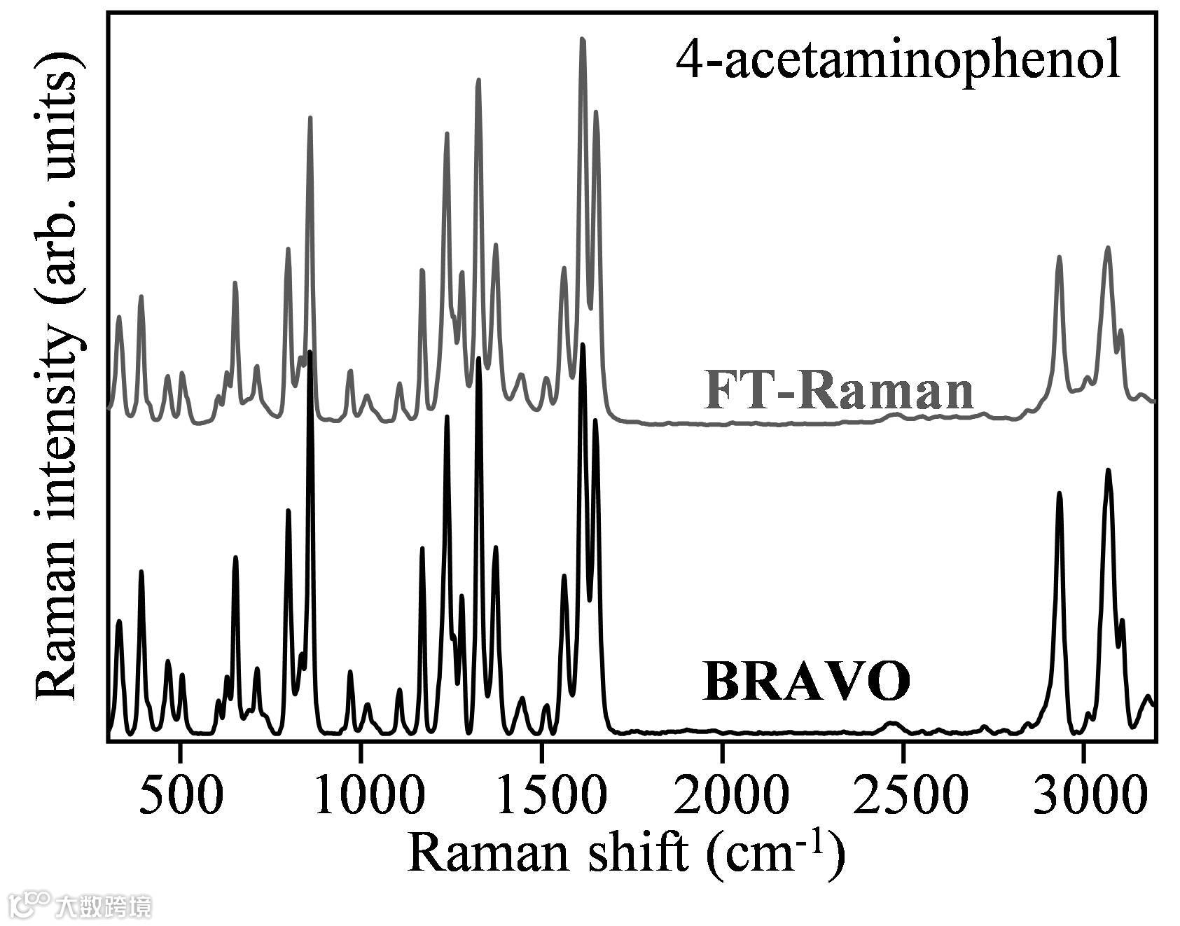 BRAVO采集对乙酰氨基酚可以获得与FT-RAMAN检测相媲美的拉曼光谱,此外、BRAVO因采用了Duo LASER双激光器技术,检测到了3000cm-1附近的C-H振动的拉曼位移信号,更宽的光谱范围造就了更广的样品适用范围,从而使得用于原材料鉴定的标准就可以更加精细化。