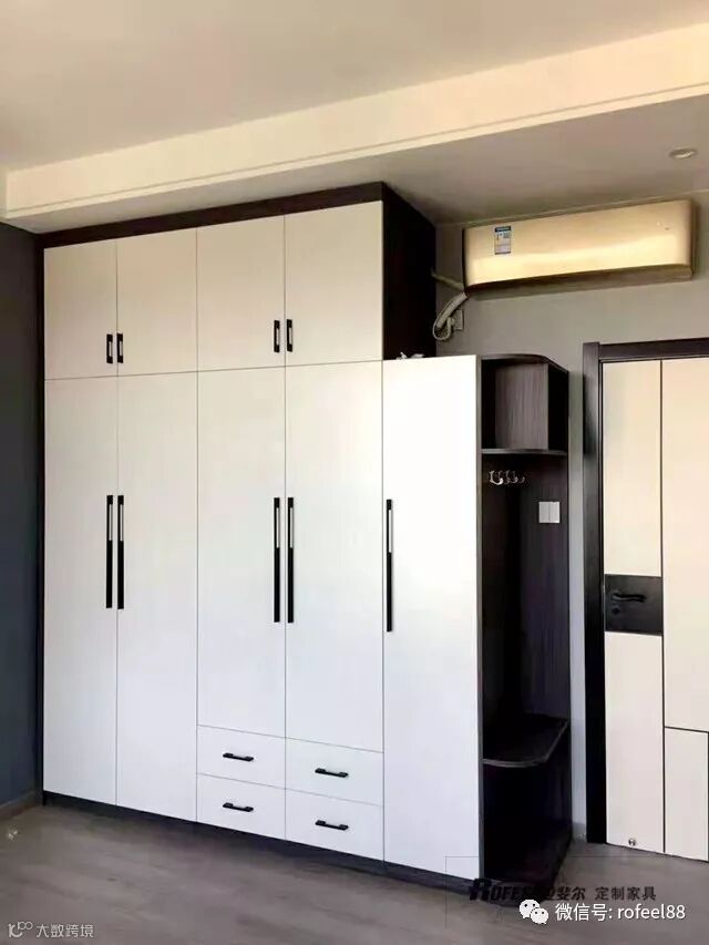 经典的黑白卧房衣柜,它是这接采用到顶设计,一方面增加了衣柜的收纳性能,另一方面直接避免了灰尘落顶,减少了客户打扫不必要的困难麻烦