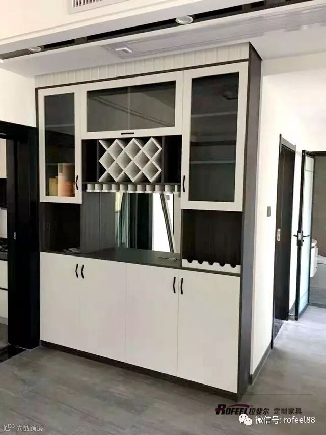 经典的黑白色酒柜,采用两边对称的玻璃掩门设计,中间主要设置酒格和酒杯架,用于储存红酒和放置酒杯。整体简约沉稳,不俗气,尽显主人的生活高品味
