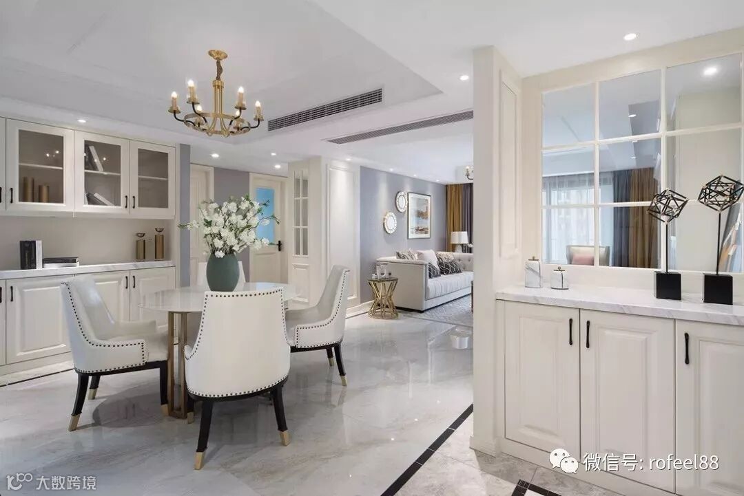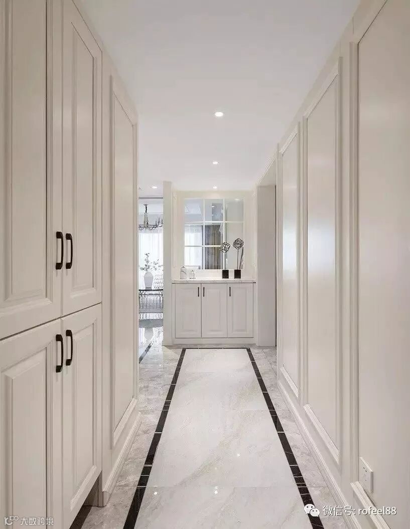 ▲ 过道处设计了一排柜子,在丰富空间的同时又增加了储物功能,简约的线条感与美式风格呼应,优雅大方。