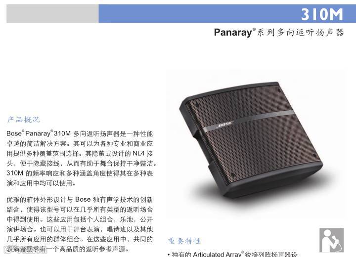 BOSE 博士 Panaray 310M 返听 会议 音箱 扬声器 Panaray® 310M 博士 返听 会议 音箱 扬声器 原装正品 BOSE Panaray 310M Bose 博士 Panaray 310M 多向返听扬声器简洁且多用途。 Panaray® 310M 多向返听扬声器可以灵活的运用于您的设计中。无论安装在哪,都不会影响它的性能和整体美观。扬声器设计将一个5.25(133mm) 英寸的单元安装于一个多方位内格中,三个2.25(57mm) 英寸单元安装于一专利的铰接列阵腔体中。这创新的腔体结构,Bose独特的科技使310M的三种方式可以用于所有舞台.