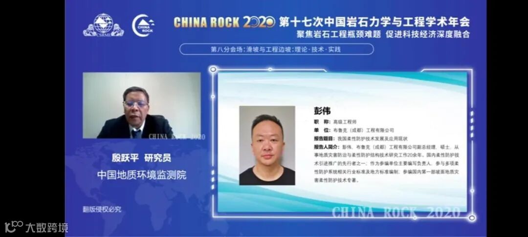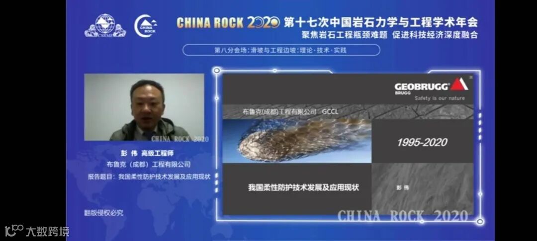 布鲁克(成都)工程有限公司参加了本次大会及主题为滑坡与工程边坡的第八分会场专题研讨会,副总经理彭伟先生做了题为柔性防护技术应用与发展的专题报告,与线上参会行业专家、学者和工程技术人员进行了深入的交流与探讨。在边坡加固、落石防护、泥石流防护等地质灾害柔性防护领域,布鲁克在行业内都是具有代表性的企业,也是将柔性防护技术从国外引进到国内的先行者。通过本次会议能够让参与的各单位代表对我国柔性防护应用现状及存在的问题有了更深的认识,让柔性防护产品和技术得以更好的应用。