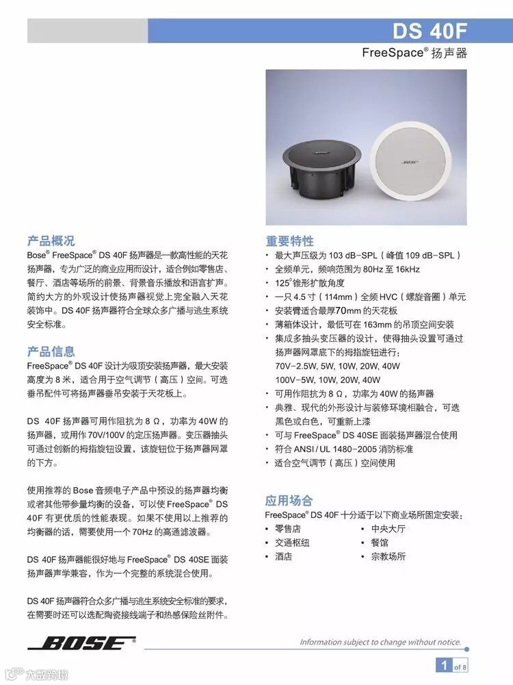 Bose FreeSpace DS40F/SE扬声器是款高性能吸顶和壁挂安装扬声器,专为广泛的商业应用而设,适合用于商店、餐馆、酒店、咖啡厅、酒吧、展厅、SPA馆、瑜伽馆等高端场合的背景音乐播放及语言扩声。简约大方的外观设计使扬声器视觉上完全融入天花装饰中。DS 40F 符合全球众多广播与安全标准。