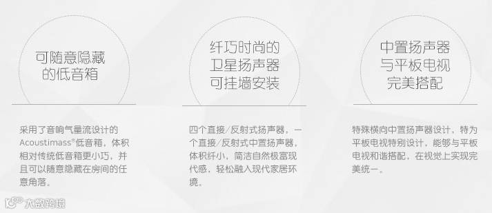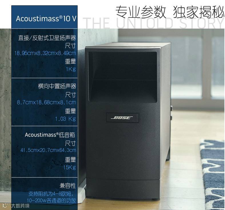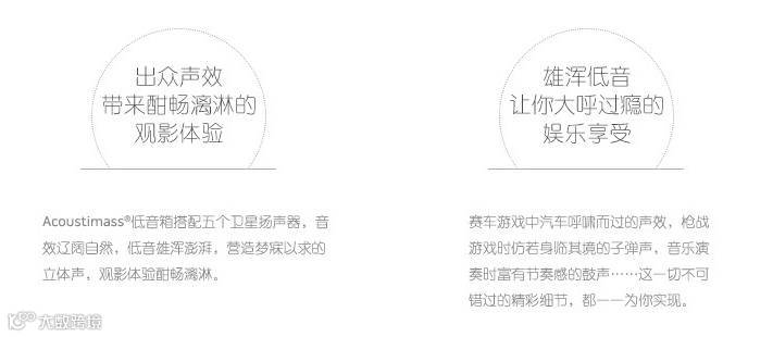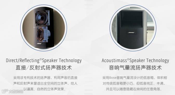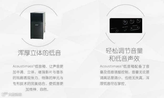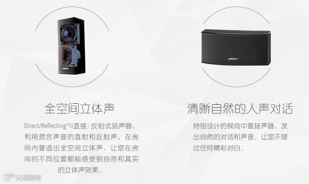 这款音响采用5.1结构,其中低音炮采用Acoustimass设计,内置两个下的低音发声单元;4只直接/反射式卫星箱可以通过直射发声和反射发声两种方式,向两个方向进行发声立体音效更强。体积较小是Bose旗下的高端家用产品。