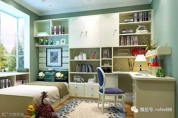 作为大家长,自家小孩的卧室肯定有这么一套书柜书桌。图上这一套是最常见的造型,书柜,底下就是个方正的写字台,看需要,还可设计成电脑桌。