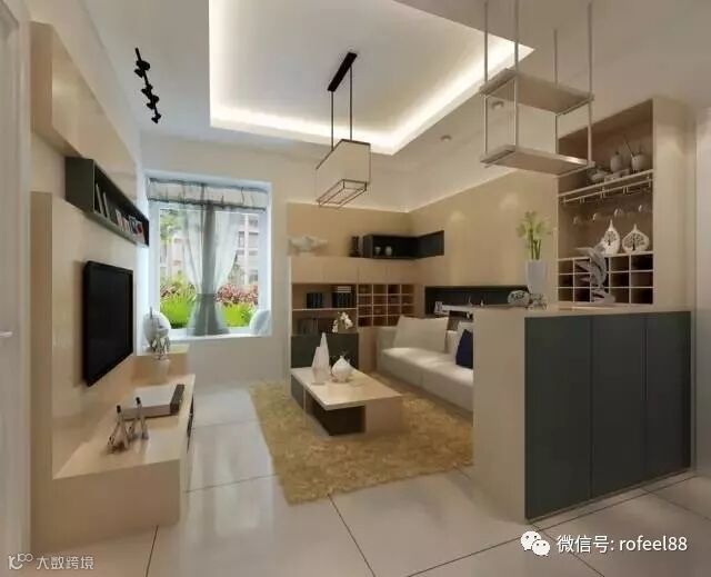 比如沙发,可以选择只有坐垫和靠背,而无扶手的款式,看上去会轻巧得多;再如电视柜的选用,地柜摆放必要的音响就足矣。