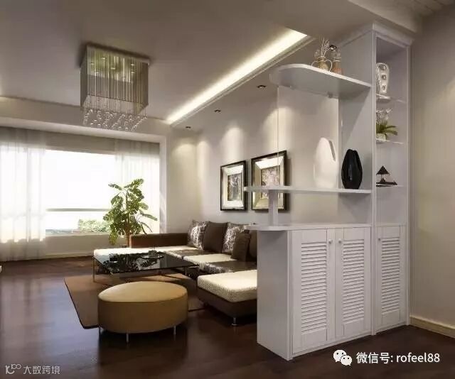 选择恰当的位置设计小体量的隔断装饰,简洁明快的隔断会反衬出空间似隔非隔的效果。隔断的正面面积最好不超过墙面面积的1/5。