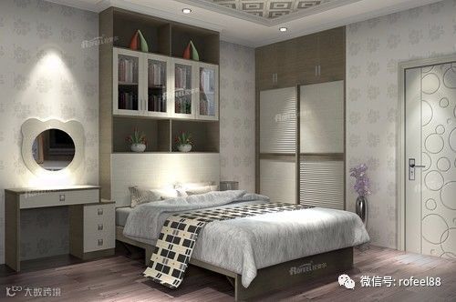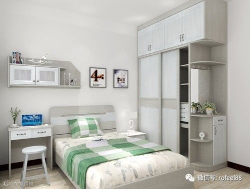 看上去没什么特别的,但是实际上大家留意一下,清新淡雅的衣柜和床再配以床头上的一片绿叶,瞬间让整个卧室充满了活力,这个设计可是别有深意喔~