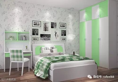 绿色的搭配将整个房间增添了几分童趣,卧室的墙面是选用碎花壁纸与书桌和衣柜完美搭配,营造出温馨舒适的氛围。
