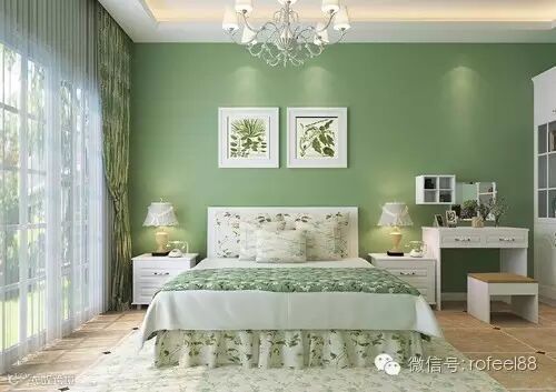 田园风格的卧室总能给人休闲快乐的意境,绿色的小清新,大概很多人都难以拒绝吧,绿色充满生机绿植的窗帘搭配碎花床单,卧室家具的所有柜子颜色均是用象牙白色搭配,清新中又透露着一股时尚的气息。