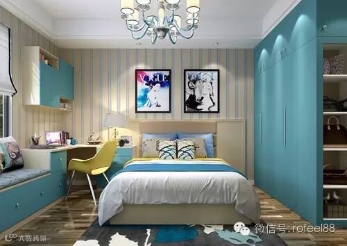 蓝色时尚风格,进入卧室就有股清新浪漫的时尚风迎面扑来,衣柜等家具全用的水湖蓝色门板,墙面用条纹浅色过度,色彩搭配有层次感,灵活自然,在视觉上给人无限的享受。