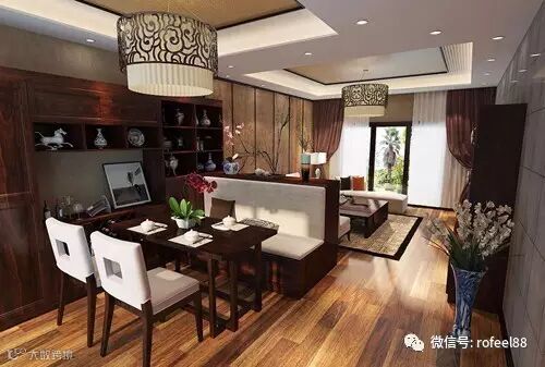 客餐厅用高矮收纳柜作隔断,矮柜可收纳,铺上软垫便成了餐椅,大大地节省了空间。高柜的台面能展示,摆放几盆植物,增添不少生机。柜体使用深色调,圆润,温婉,散发出一种古朴典雅的迷人魅力。