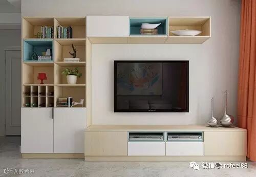 客厅电视柜用白枫和象牙白为主色调,水湖蓝在开放柜中作点缀色,空间色彩清新淡雅。电视柜兼具收纳、酒柜的装饰功能。