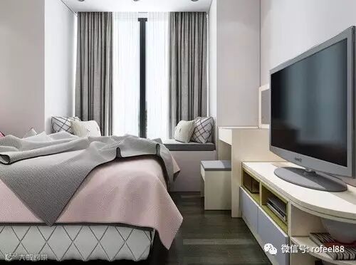 床尾视听区与梳妆台完美利用整面墙,打造了简单又舒适的卧室空间。靠窗凹位设置飘窗,增加卧室采光,同时打造舒适的休闲区。