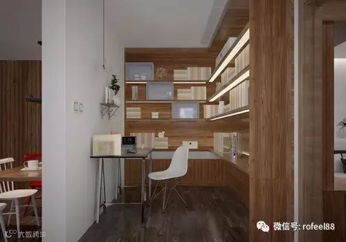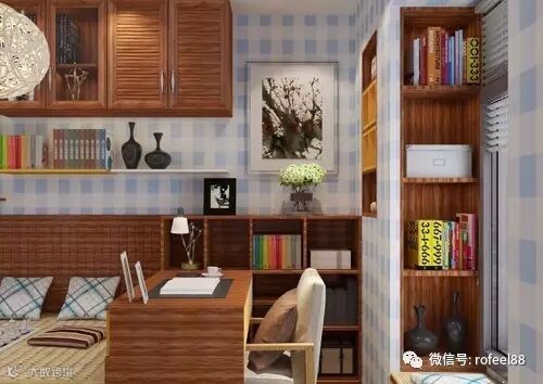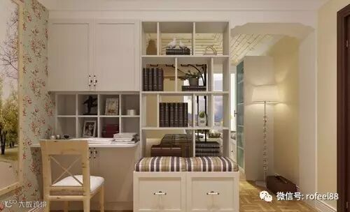 狭小的书房空间,书柜采用转角设计,储物空间强大。与卧室隔断,在不打扰家人休息的同时,又能办公学习。整个小书房不占用空间,且方便实用。特别适合小户型家庭。