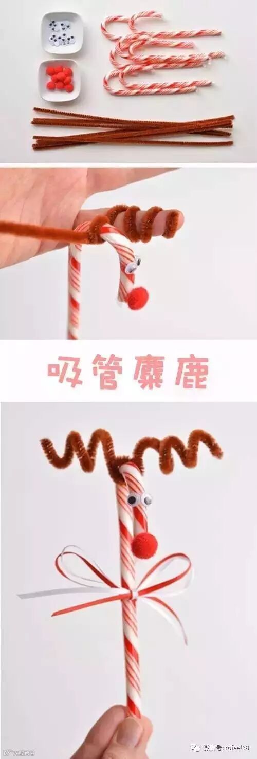 吸管,铁线绒条,塑料眼睛,红色小毛球,胶水,细丝带