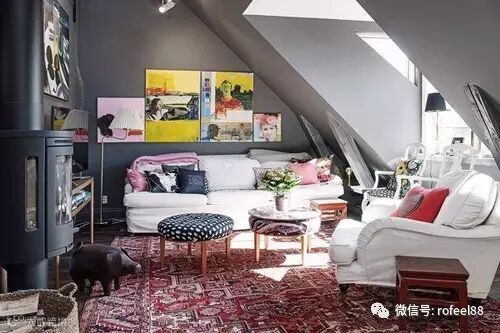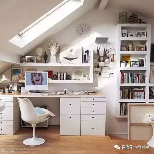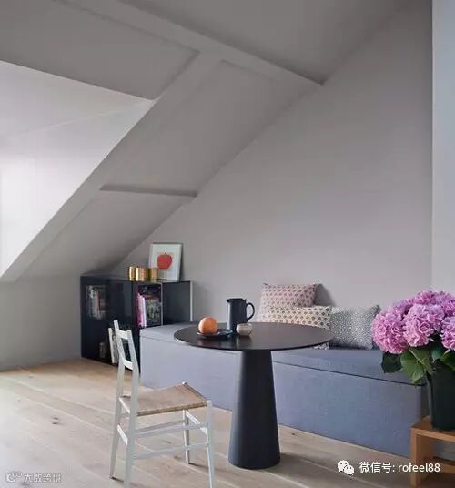 阁楼的天花板往往是倾斜式的,因此家具用品不能太高,矮小而舒适的坐椅这时候便成了最佳的选择。配上木质的书架和书桌,加上几个小型矮沙发,一个清新、简约的阅读空间就这样呈现在你的面前。