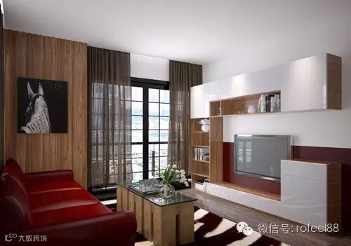 原木色的护墙板和电视柜、茶几、地板相呼应,让整个小客厅充满了大自然的清新与质感。半包围的电视柜设计,既满足储物需求,又能装饰家居环境。火红色的沙发,点燃了整个家居的热情,极具个性与时尚。