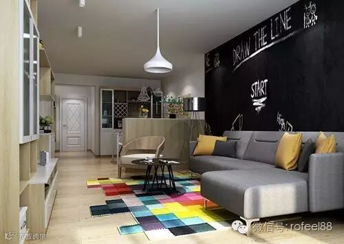 客厅是家庭居住环境中最大的生活空间,也是家庭的活动中心,装饰应生活化,并彰显主人的个性。客厅的背景墙可以设计为黑板墙,黑板墙不仅限于黑色,还可以使用其它各种颜色。既能提亮客厅的色调,提升色彩的层次感,又能提升整个空间的新意与个性,不陷入俗套。
