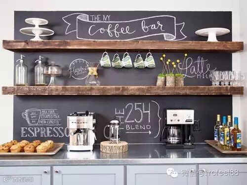 黑板能够涂写的功能,完全可以大胆地使用在家居装饰里面。对于装饰单调又需要记录的厨房来说,使用黑板墙最为合适了。既能起到装饰作用,又能在黑板墙上记录今日菜谱、小贴士,非常实用,可以帮助你更清晰地完成烹饪任务。