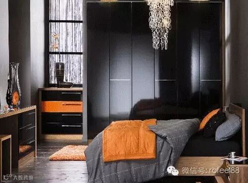纯黑色的整体衣柜,配上绚丽的吊灯,使整个房间显得低调而奢华。橙色在点缀其中,打破了原有的沉闷感,给整个卧室带来注入了活力。