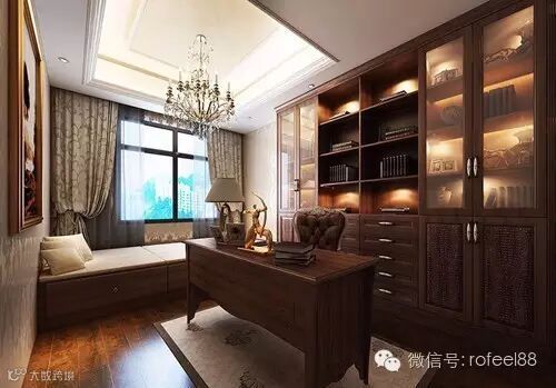 独立式书桌是最传统的一种,书桌和书柜分开。这个书房整体给人一种高贵、大气、沉稳的感觉,是书房主人丰富阅历和见识的外在表现,书柜根据使用频率分为开放区和封闭区。书桌的颜色与书柜的颜色相呼应;由于书房的空间较为宽敞,书房的独立摆放反而弥补了空间的单调感。