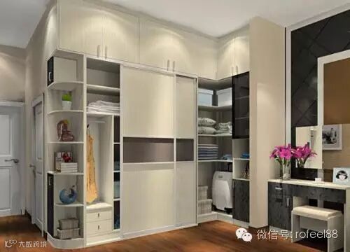 圆弧的设计可以让主人放置一些装饰品,来丰富自己的卧室,整体衣柜的设计和转角装饰柜的组合设计使得空间变得更加完整,充满了时尚的魅力,刚好处理了整个卧室的特殊房型,空间变得更加丰富,梳妆台的造型也是很和谐的风格。