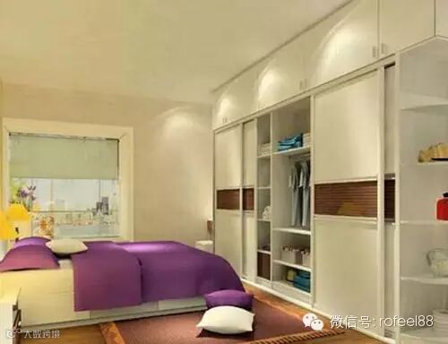 天花板的颜色必须浅于墙面或与墙面同色。当墙面的颜色为深色的时候,天花板必须采用浅色。衣柜颜色应该根据整个房间的墙壁和地板等色块来选择。