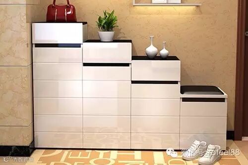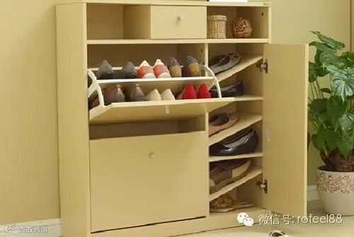 如果鞋柜的隔板是固定结实的,那么隔板上将会产生难以打扫干净的死角,所以选购鞋柜最好选择活动式的隔板,最好是人性化的翻斗设计(斜插)、取鞋更方便,并且隔板不能伸展至尽头,有空间才能让鞋子的灰尘落到最底层,最大程度保持柜内空间的干净。另外,选购鞋柜的款式最好选择底部设计有一层以上开放式隔板的,这样更方便主人把常用鞋、还有来访客人的鞋子放在鞋柜,避免地上一片凌乱。